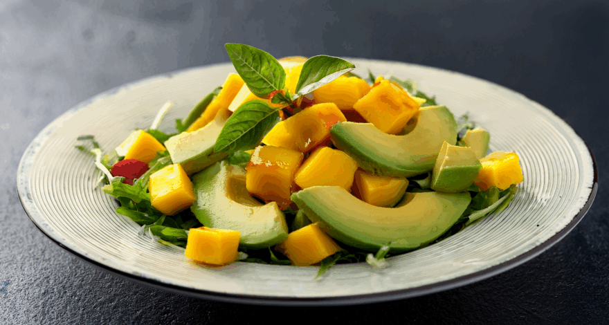 2 teaspoons fresh basil 1/2 teaspoon sea salt 2 tablespoons extra virgin olive oil 1 tablespoon freshly squeezed lemon juice 1 cup cooked garbanzo beans (cooked well and rinced) 2 ripe avocados, chopped in squares 1/4 cup minced chives or green onion 1 ripe mango Smash the basil and...